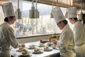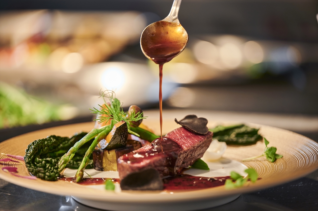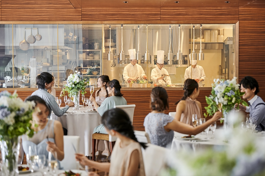 パーティ会場に併設したオープンキッチンから作り立ての料理を提供。調理シーンが見える安心感とパフォーマンスが魅力。新郎新婦はシェフやパティシエと直接打ち合わせすることができ、地元の食材を使用するなどオリジナリティの表現が可能です。