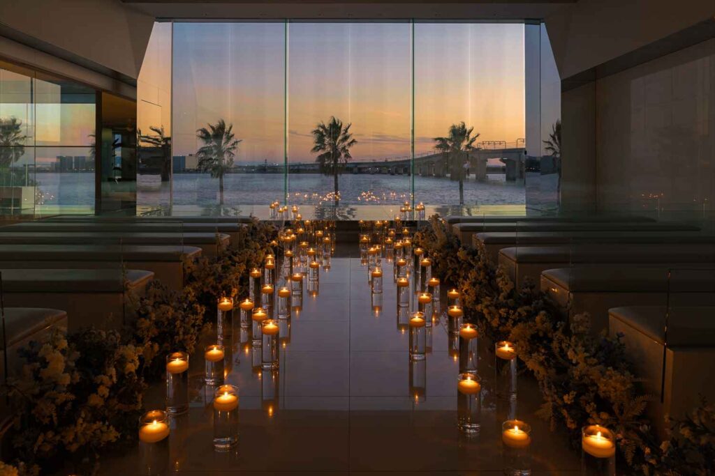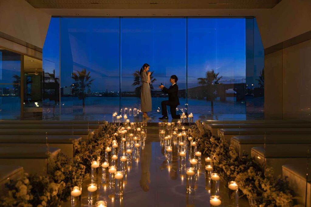 ロマンチックなサンセットを眺めながら、貸切のチャペルでプロポーズ。大空と海の絶景がおふたりを祝福します。