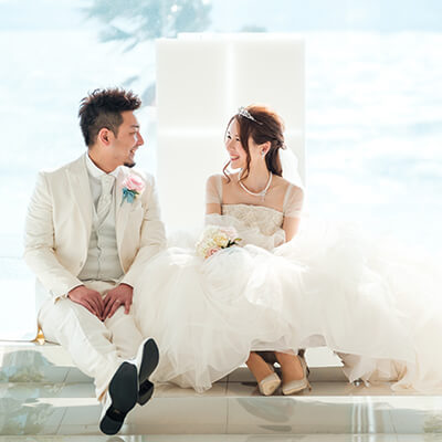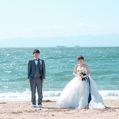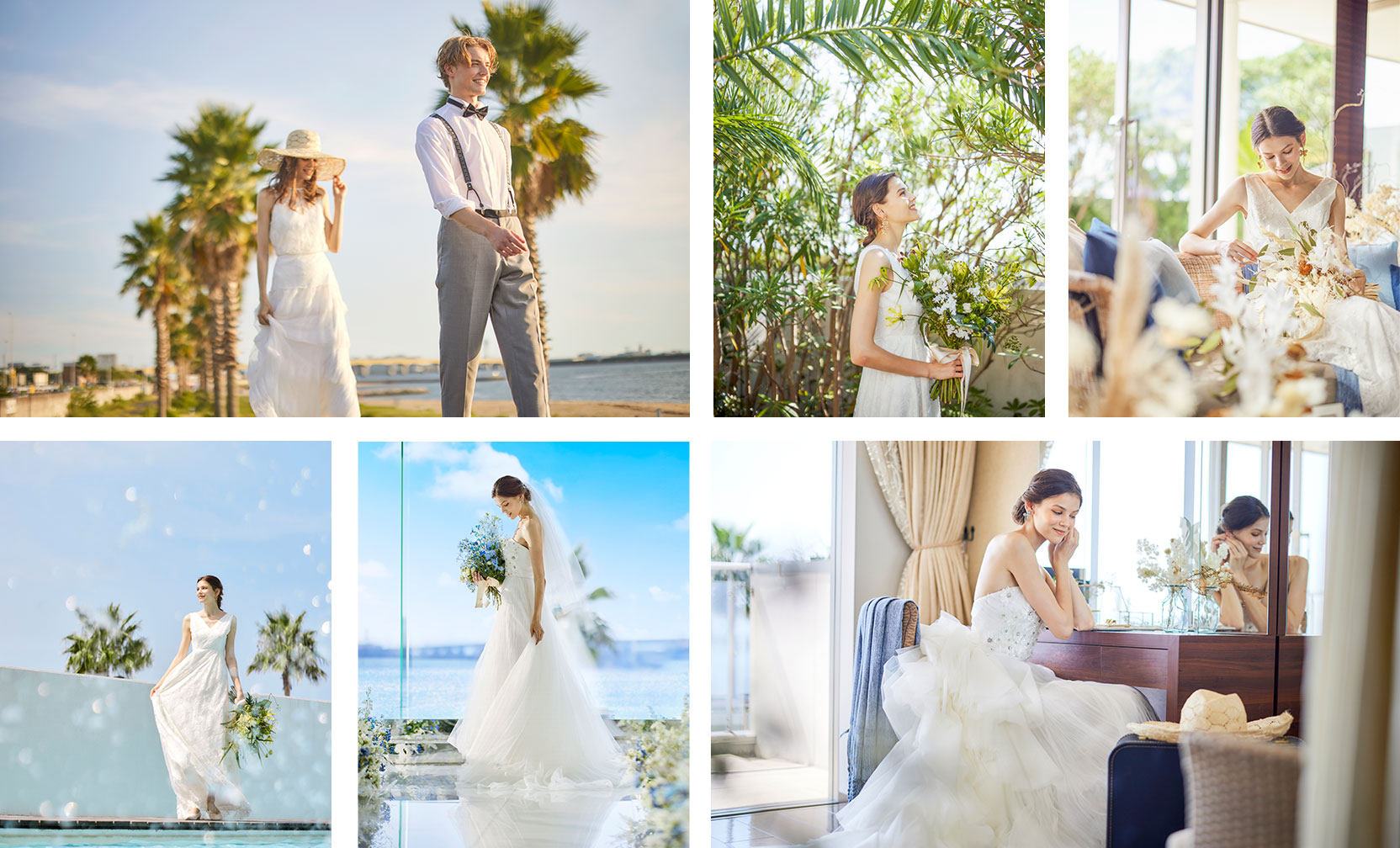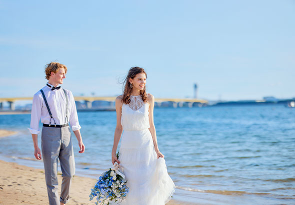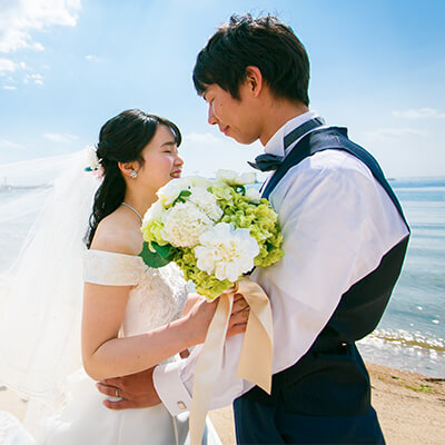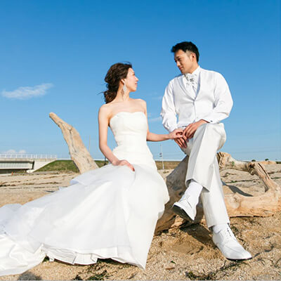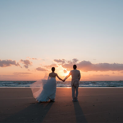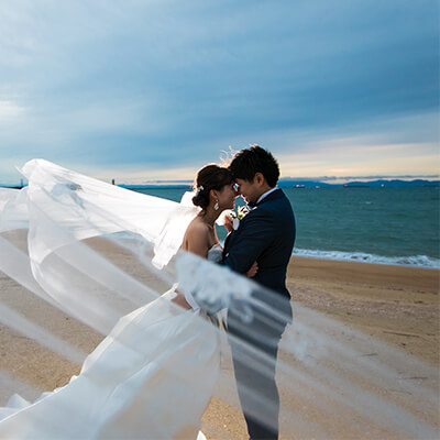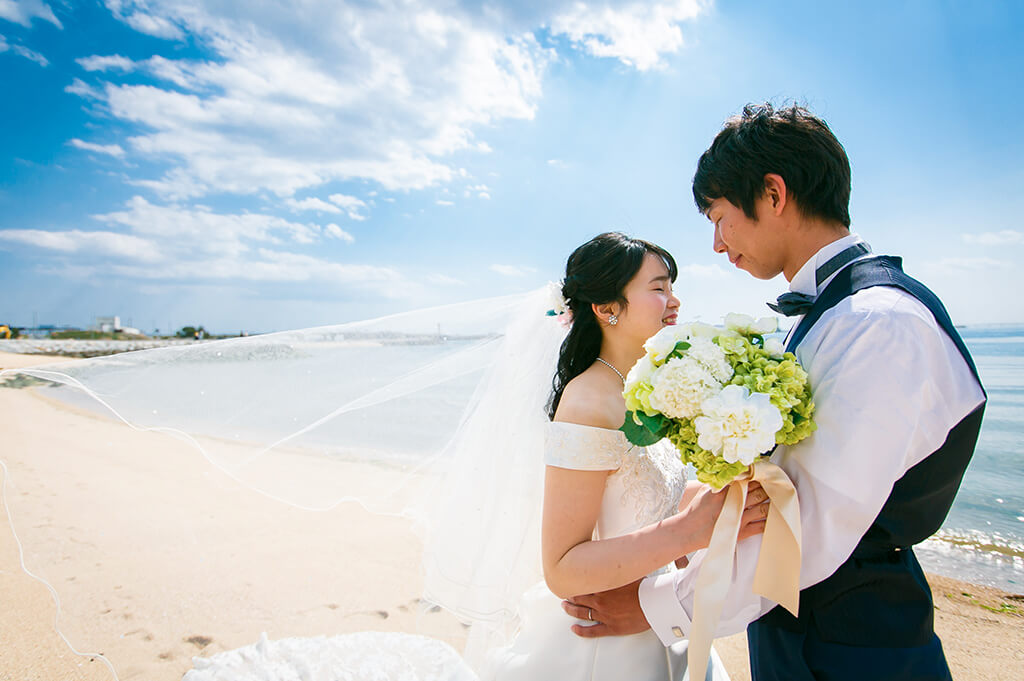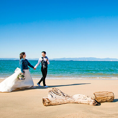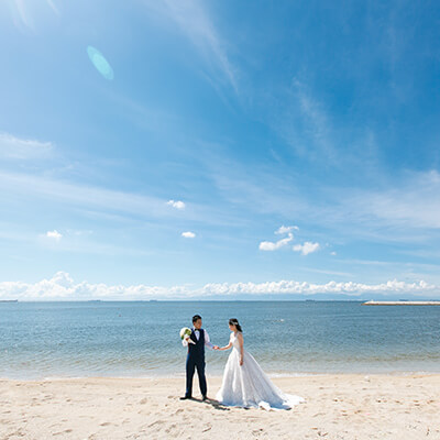 白砂のビーチでのロケーションを活かした前撮りがお楽しみいただけます。