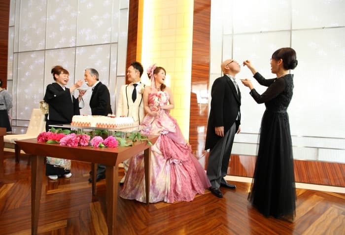 衣装が3着とも秘密ということで 当日までお互いにドキドキでしたね 特にカラードレスの対面はゲストの方とけんじさん参加の ドレス当てクイズという形で非常に盛り上がりました! しかし見事にはずしたけんじさん 罰ゲームのピコピコハンマーには会場が笑いに包まれました!