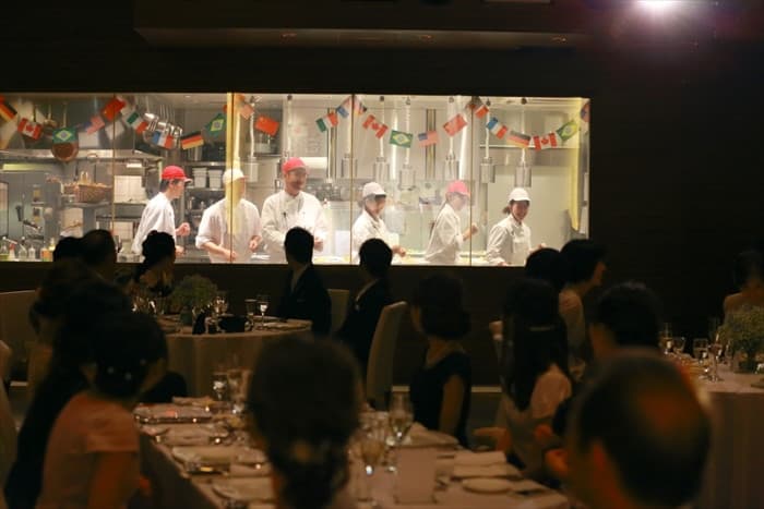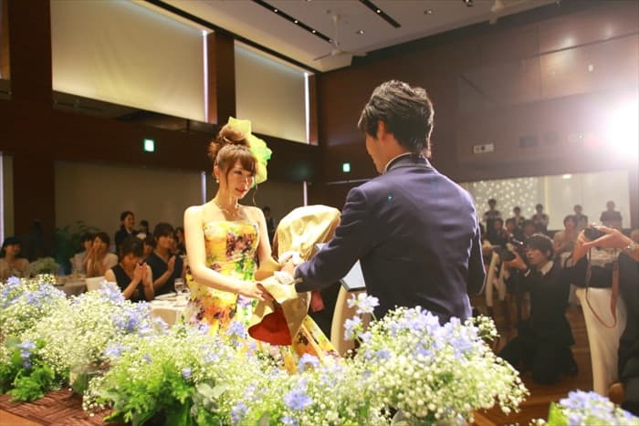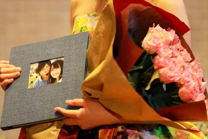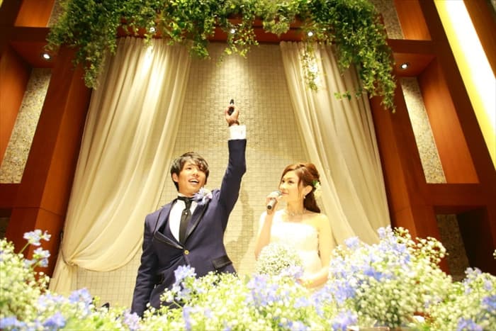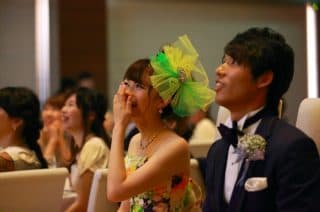 人前式から親族・友人だけではなく、教え子たちにも見守られながら、誓いを立てることができました。 ゲストのみなさんに楽しんでもらえるような式にしたいと、お菓子まきや私たちにまつわるテストを実施し、披露宴会場のキッチンには万国旗! キッチンスタッフの方たちも赤白帽をかぶり、会場を盛り上げてくださいました。その後も笑顔あり、涙ありの夢のような時間を過ごすことができました。