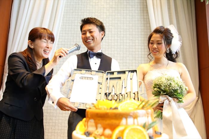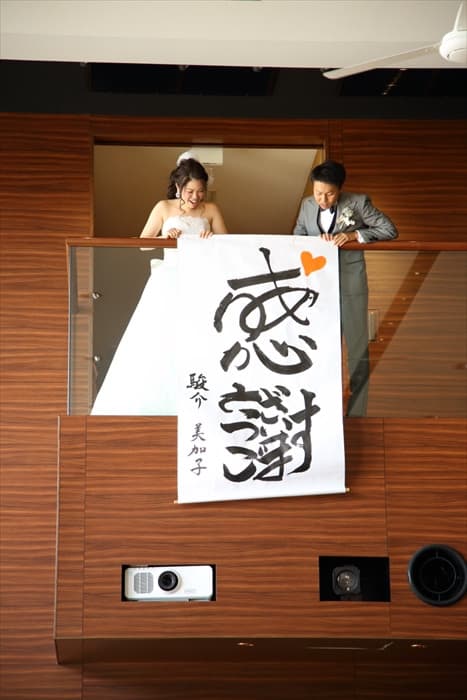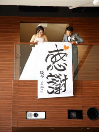 “おふたりらしい1日に”をテーマにお打合せを重ね、しゅんすけさんの好きな“キャンプ”とみかこさんの師範級の“書道”の腕前を取り入れた1日を創ることができました。 おふたりで手作りされた世界に一つだけの結婚証明書や披露宴入場での「感謝」の垂れ幕は、ゲストの方々を驚かせていましたね。ケーキイベントではしゅんすけさんがキャンプで実際に使われる包丁セットで入刀をおこない、笑顔溢れるあたたかいお時間となりました。フランベ演出もとてもかっこよくきまり、おふたりが届けたお肉料理を受け取った親御様の嬉しそうな表情が印象に残っています。