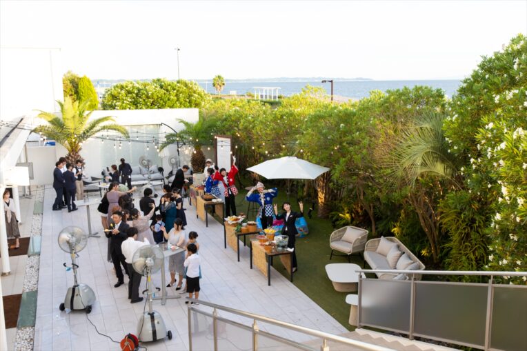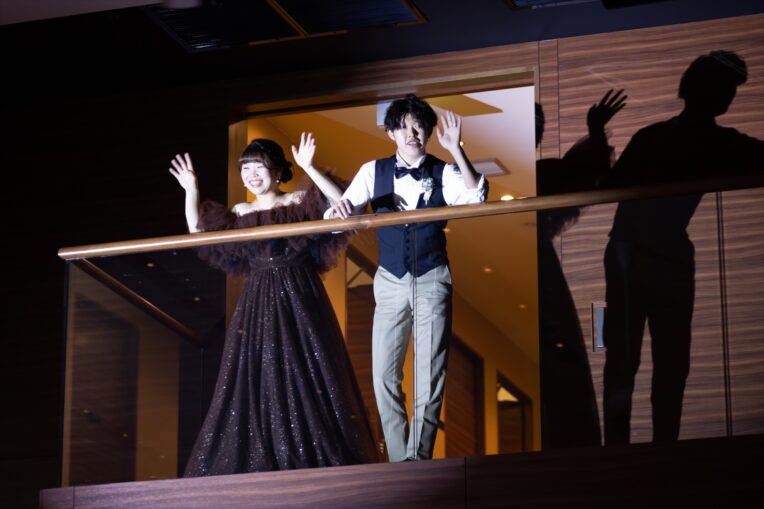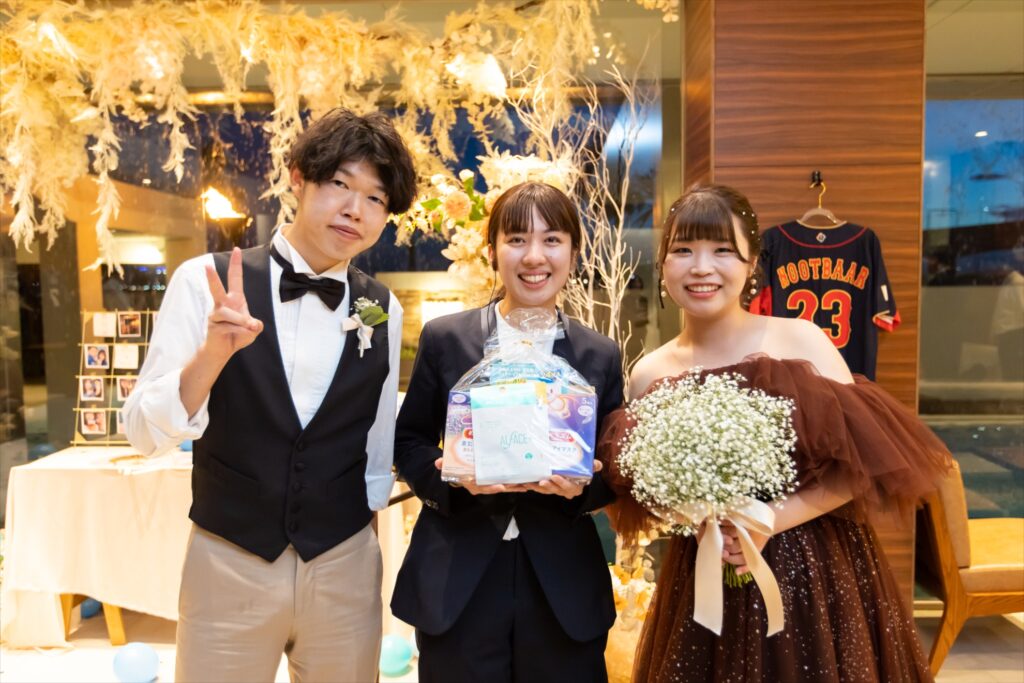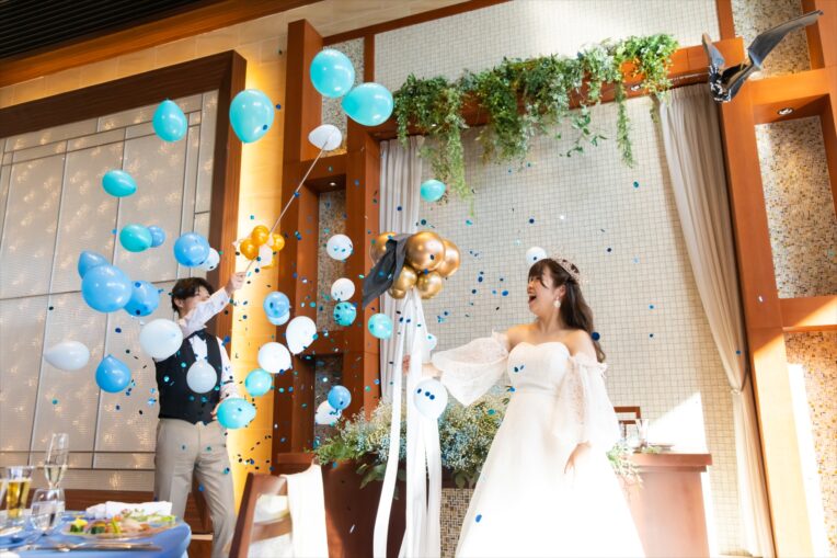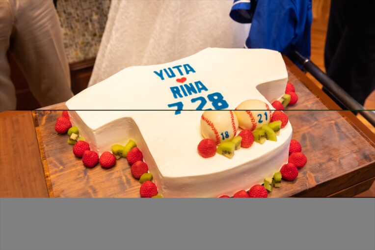 誰か1人に焦点を当てるのではなく全員が楽しめるおふたりの色が沢山詰まった結婚式にしました!各場面全てがこだわった1日にはなりますがその中でもキッチンOPENからのゆうたさんがバルーンを持って入場のジェンダーリビールバルーンはこだわり、またケーキイベントでは大好きな野球のユニホーム着て野球のモチーフのケーキはゲストもおふたりも盛り上がりました!
