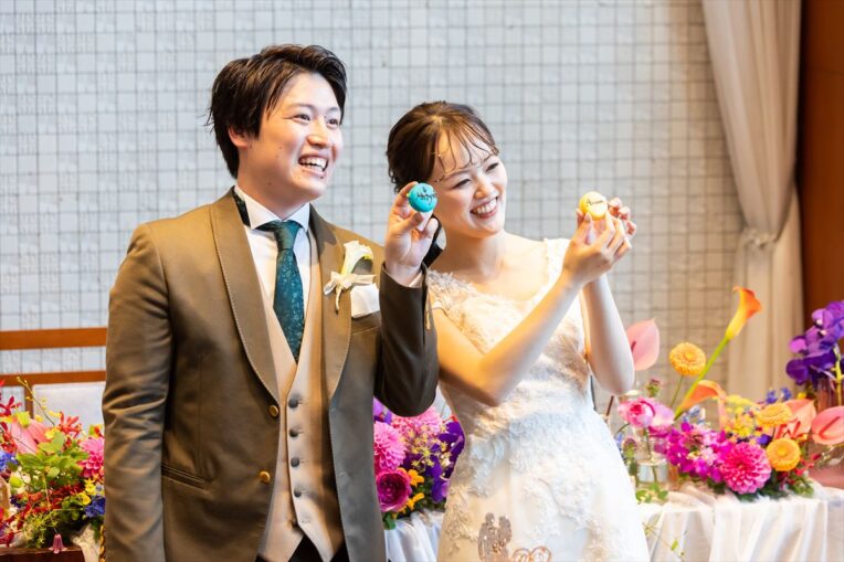 【フラワーセレモニー】あんなさんが「お花が好き」ということでフラワーセレモニーを取り入れ、カラーのお花を選択していたおふたりに花言葉を交えながら、演出として取り入れる提案をさせて頂き、「これからも一緒にいようね」の意味がこめられた9本のお花でブーケを作成しました。
