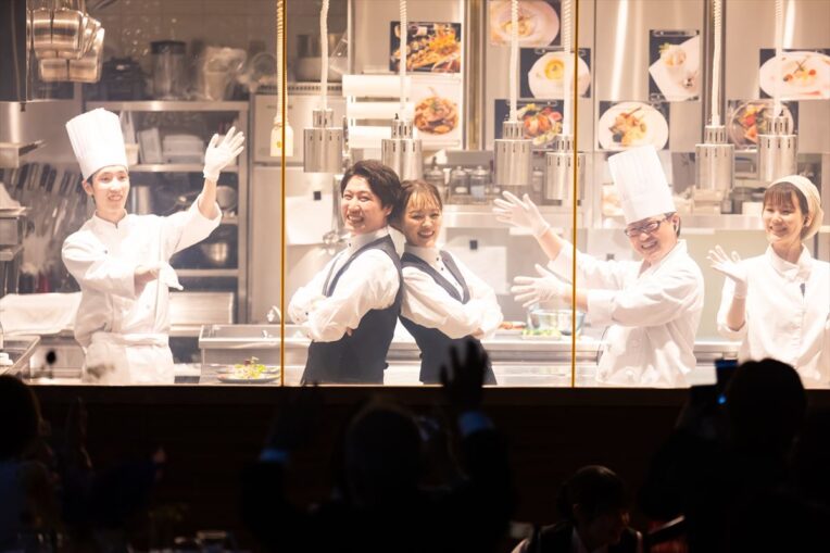 【OPENキッチン】結婚式当日は父の日ということもあり、おふたりがアルバイト時代の制服でキッチンに登場し、お父様にお肉料理を届けました。おふたりの懐かしい姿にアルバイト時代をともに過ごしたご友人の方々も大盛り上がりでした!