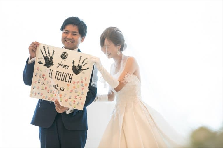 ゲストの方とのつながりを大切にしたいと思い、テーマを『Hi touch with us』としました。テーマを基に作成したハイタッチの手形をあしらった結婚証明書に、ゲストの皆さんにサインをしていただきました。またブライズメイドとのドレスアップセレモニーや新郎からのサプライズなど、笑いあり涙ありの最高の1日になりました。