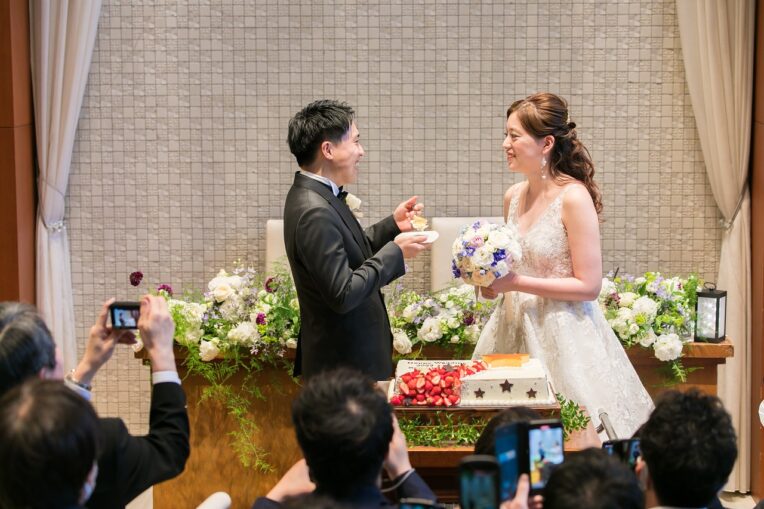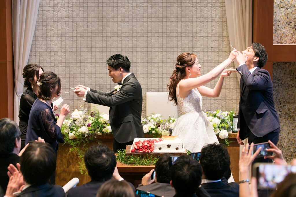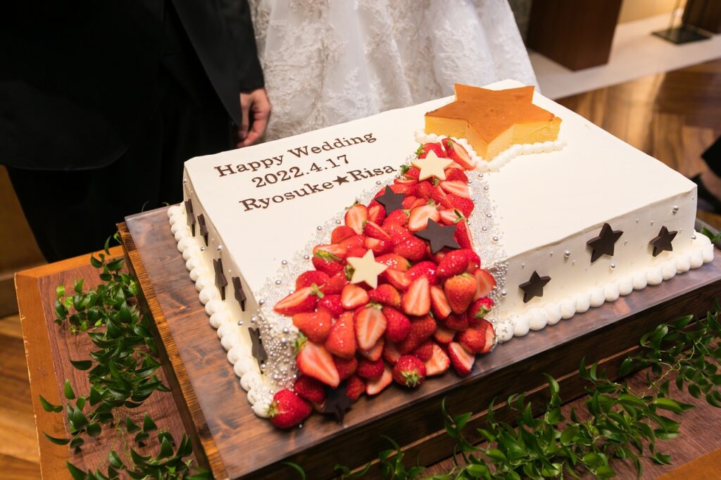 おふたりのウエディングケーキは、りささんの好きなものを詰め込んだ、世界にひとつのオリジナルケーキに!たっぷりのフルーツに星のモチーフとキラキラのデコレーション!真っ白なクリームの上にはりささん専用の星型ベイクドチーズケーキをあしらいました。