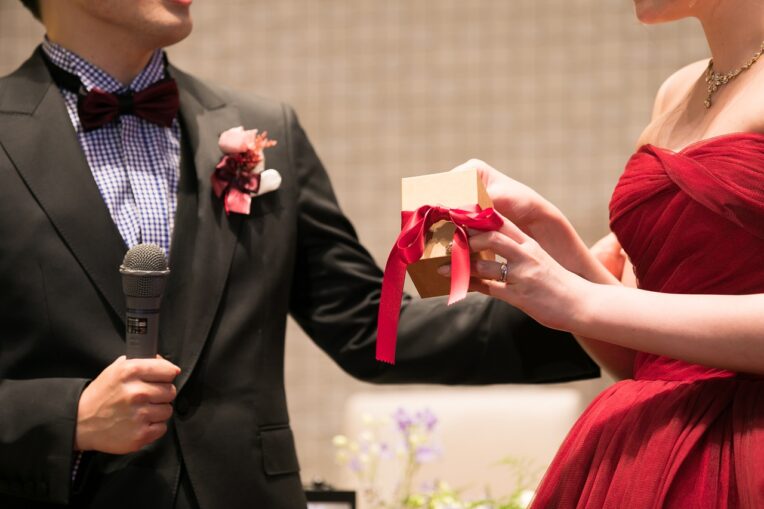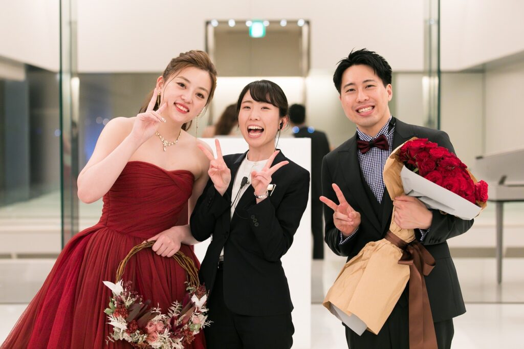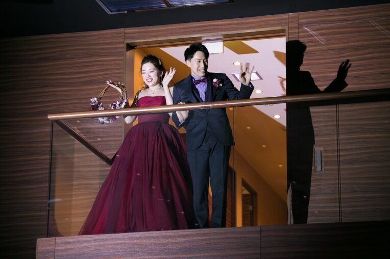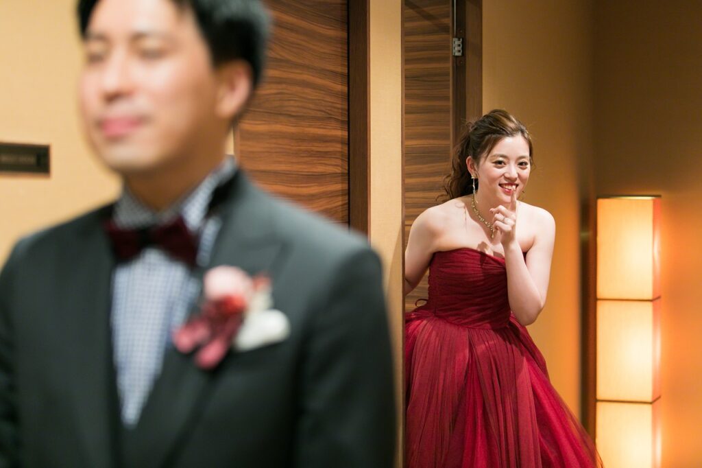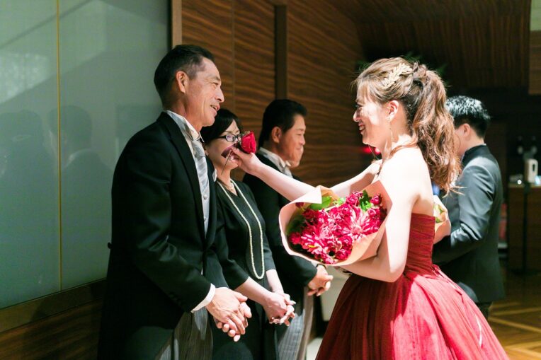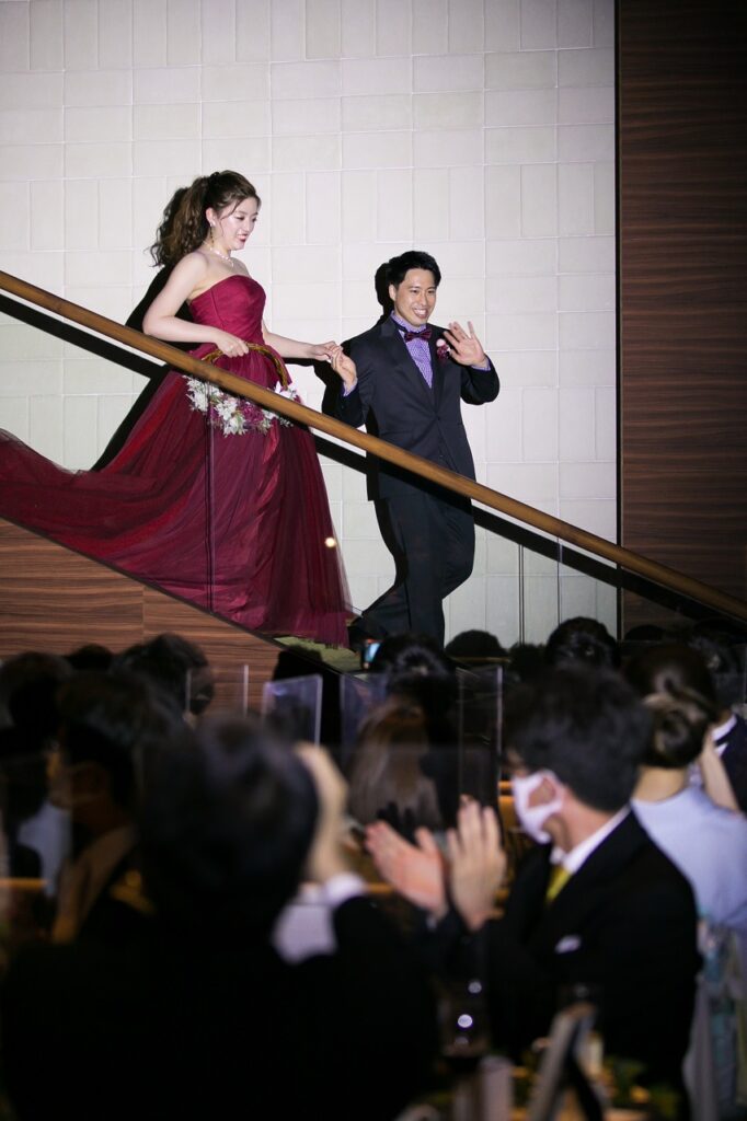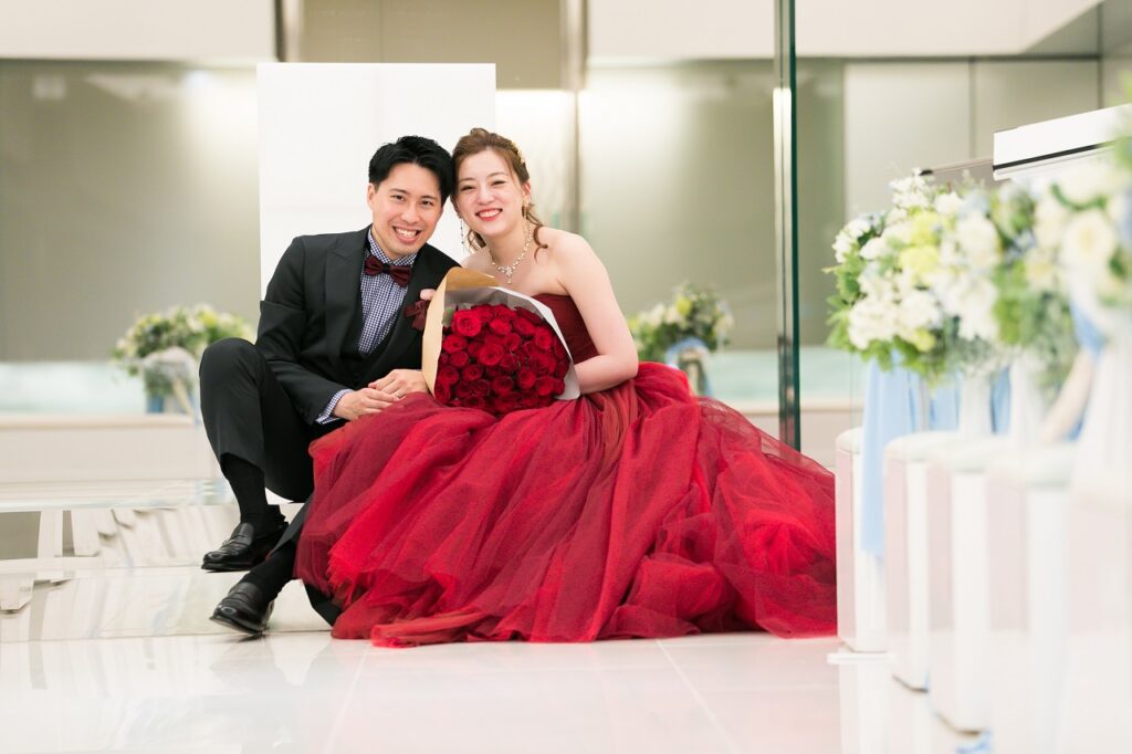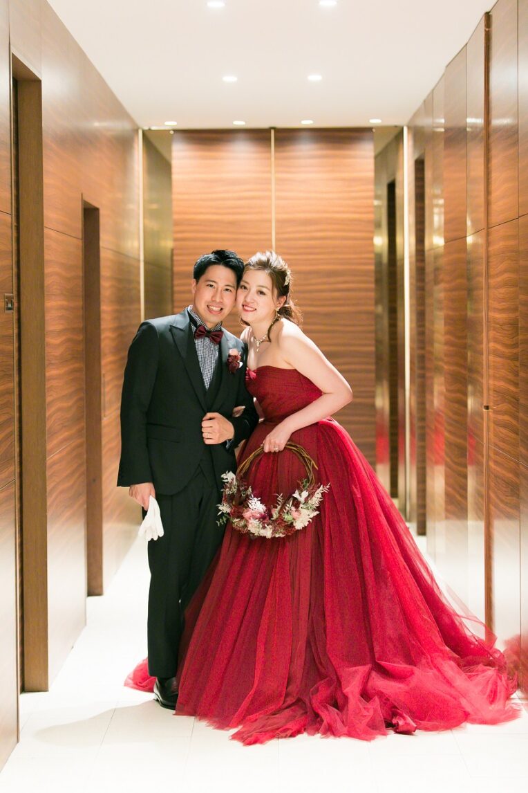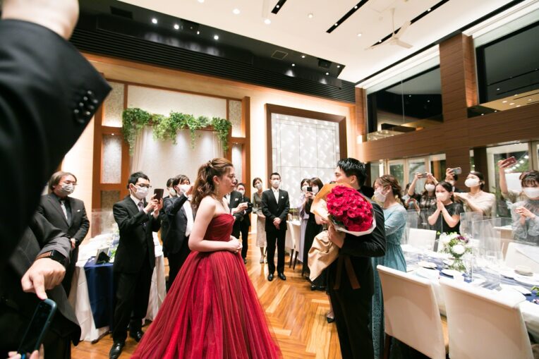装いも新たに、お色直し入場は真っ赤なカラードレス姿でご登場です!実は今日まで、ドレスのお色味を、りょうすけさんにも内緒にされていたりささん。その美しいお姿に、ゲストの皆さまだけでなく、りょうすけさんからも素敵な笑顔が溢れるお時間となりました。