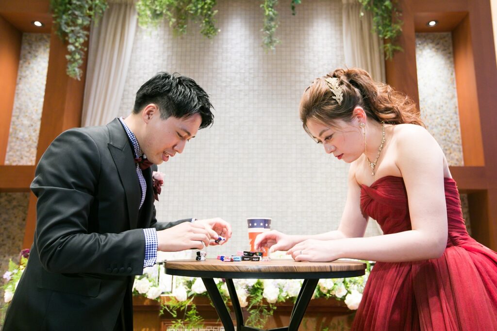 おふたりが、「ゲストと一緒に盛り上がれるイベントがしたい!」と考えた「チョコレート積みゲーム大会」。制限時間内に四角いチョコレートを何個積むことが出来るのか?ルールは簡単!でも実は意外と難しい!おふたりからもゲストの皆さまからも笑顔が溢れる、大盛り上がりの時間になりました。
